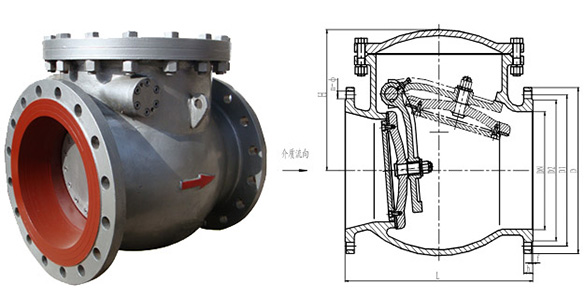 阀瓣在阀体内腔处于自然下垂状态,当开泵正常运行时,管路内的压力将阀瓣推动沿阀杆轴线转动而开启,介质通过;停泵时,阀瓣以自身重力和介质回流的压力而自动关闭实现止回。